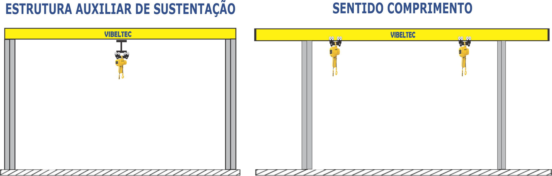 Com opção de serem equipadas com Talhas Elétricas de Corrente para capacidades de até 5.000kg ou com Talhas Elétricas de Cabo de Aço para capacidades até 12.500kg.